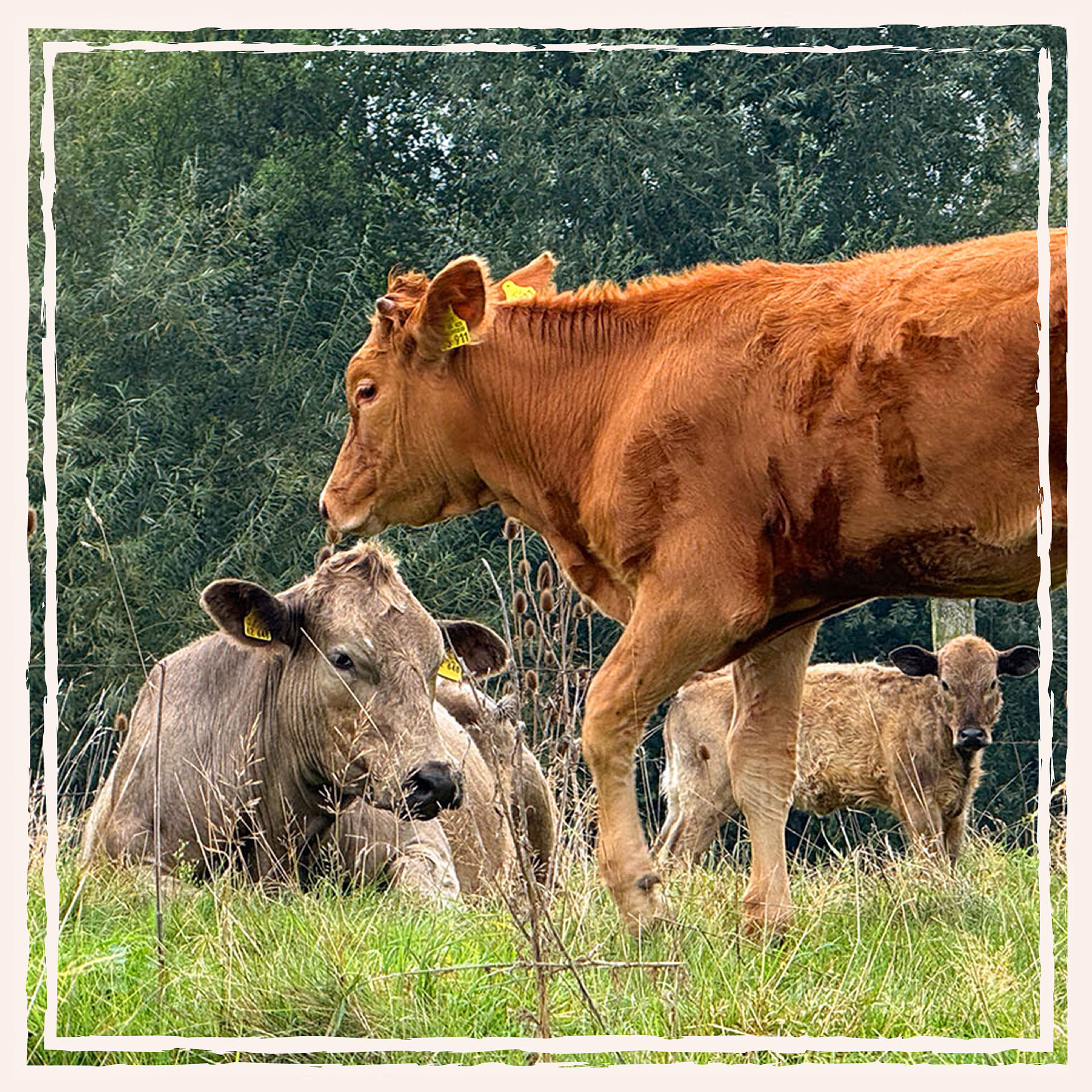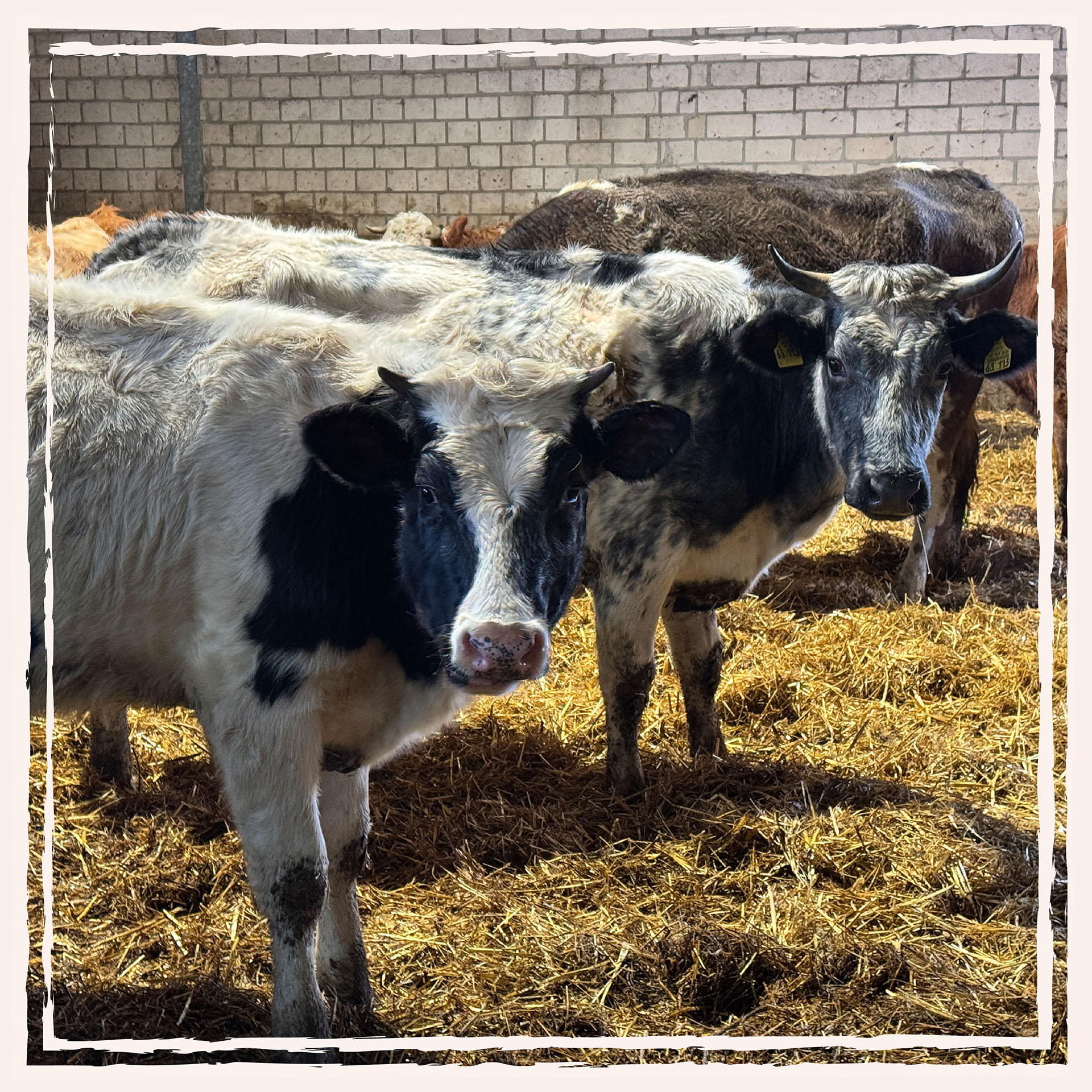 Neben dieser ganz außergewöhnlichen Rasse halten wir auch Mischrassen. Kühe und Kälber sind in den warmen Monaten auf den Weiden in der Umgebung unseres Hofes unterwegs. Den Winter verbringen Sie im großzügigen Stall mit der Möglichkeit zum Weideauslauf an trockenen und etwas wärmeren Tagen.